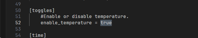 50行目あたりにtogglesっていうのがありますよね。それのenable_temperatureの値をfalseにしましょう。
